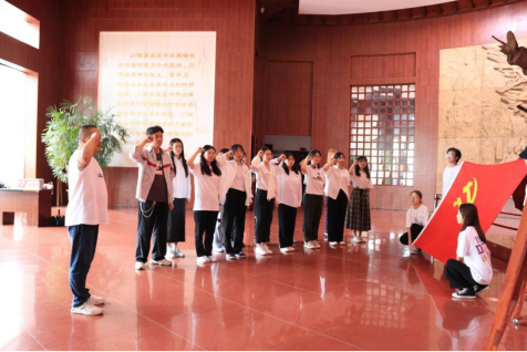 红军文化陈列馆的红军群雕前,黄崇岭老师带领毕业生党员,面向党旗庄严的重温了入党誓词,黄老师表示,我们在这里重温入党誓词,是对党员干部的一种鞭策和激励。