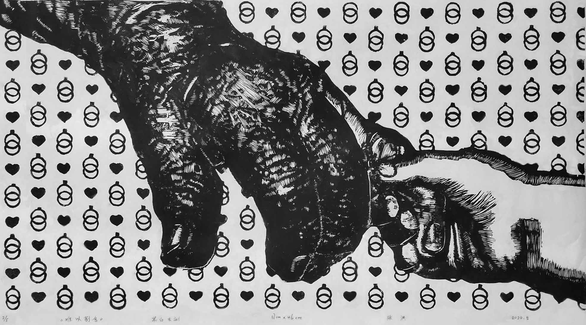 《难以割舍 》黑白木刻 87×46cm 张洪 2020 指导老师:刘承川