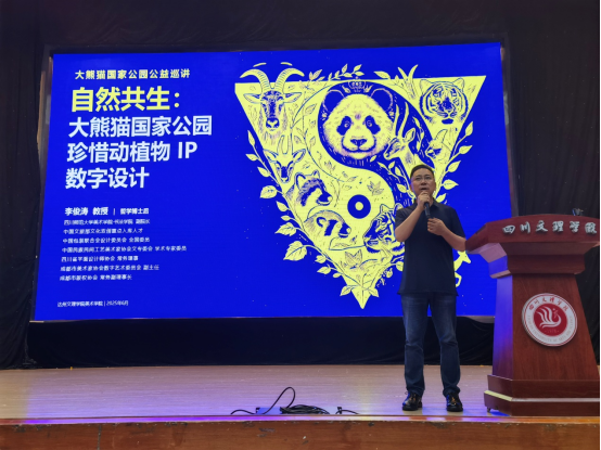 本次公益巡讲聚焦设计与教育探索、文化价值解读、艺术创作、IP转化商业实践四大核心内容。四川师范大学英国上市公司365·书法学院副经理、四川省大熊猫国家公园文化创意创新联盟副主席李俊涛教授围绕“自然共生:大熊猫国家公园珍稀动植物IP数字设计”进行了主题进行演讲。他分享了前沿的AIGC数智化设计形态,结合泡泡玛特等爆款案例和艺术作品,解析了如何打破经典风格束缚,探索符合当代年轻人审美的设计表达,展现了艺术在生态IP创新中的活力。
